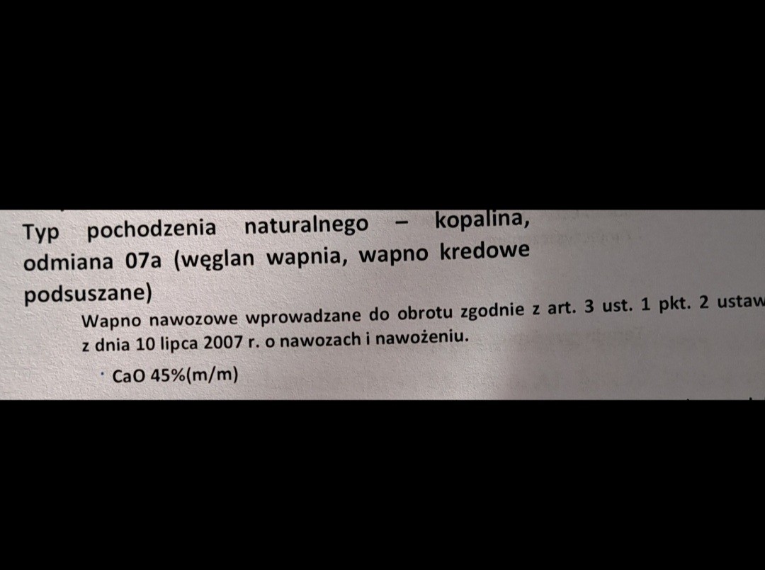TYP POCHODZENIA NATURALNEGO: Kopalina,odmiana 07a (weglan wapnia,wapno kredowe podsuszane)